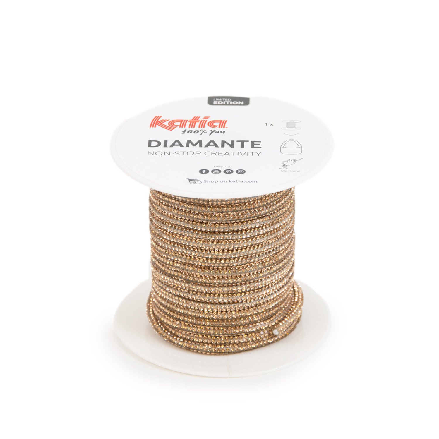 Diamante, un espectacular cordón de algodón recubierto de cristales deslumbrantes. Su formato único y su sorprendente manejabilidad lo hacen perfecto para proyectos de macramé como bolsos y accesorios glamurosos. No se deshilacha al cortar y mantiene firmes los nudos, asegurando resultados limpios y resistentes. Ideal para crear desde un bolso llamativo hasta charms o llaveros con solo una bobina. Sigue nuestro vídeo tutorial y descubre lo fácil que es trabajar con Katia Diamante.